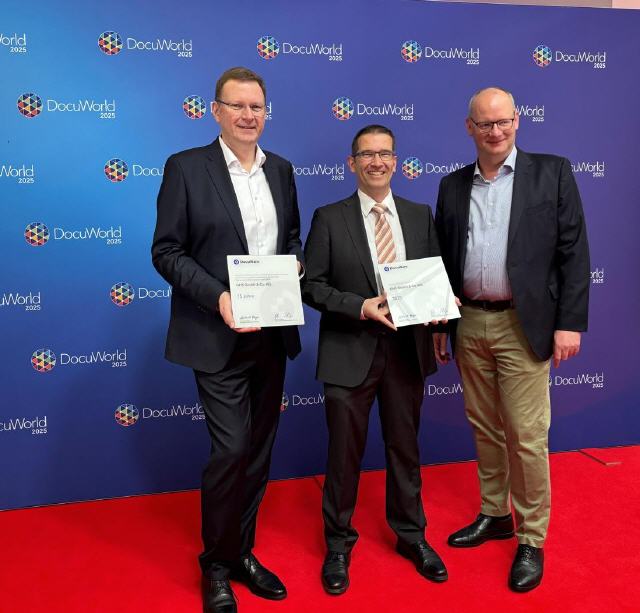 Seit 15 Jahren sind wir verlässlicher Ansprechpartner, wenn es um modernes, digitales Dokumentenmanagement geht, und unsere enge Partnerschaft mit DocuWare hat es uns ermöglicht, unseren Kunden über all die Jahre effiziente und zukunftssichere Lösungen anzubieten. Ein besonderes Highlight in diesem Jahr war die DocuWorld in Berlin, auf der Felix von Renz die Auszeichnung für 15 Jahre DocuWare-Partnerschaft entgegennahm, feierlich überreicht von Dr. Michael Berger (CEO) und Hermann Schäfer (Chief Sales & Marketing Officer).